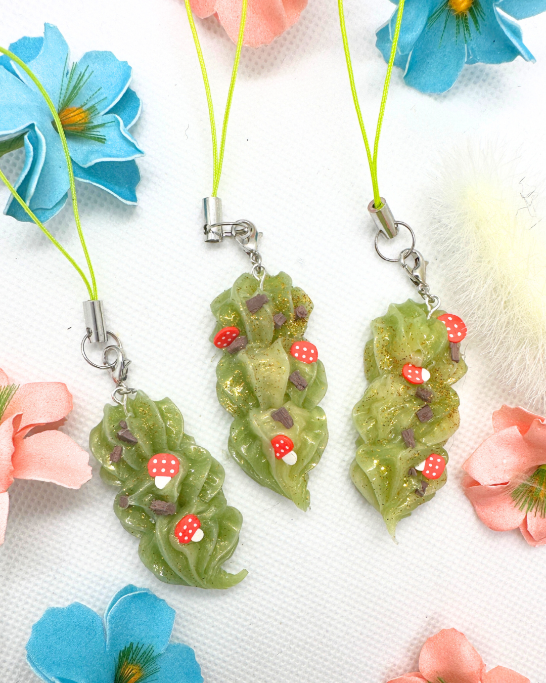 Silicone whip charm in mossy green with fake chocolate sprinkles and toadstool bits.